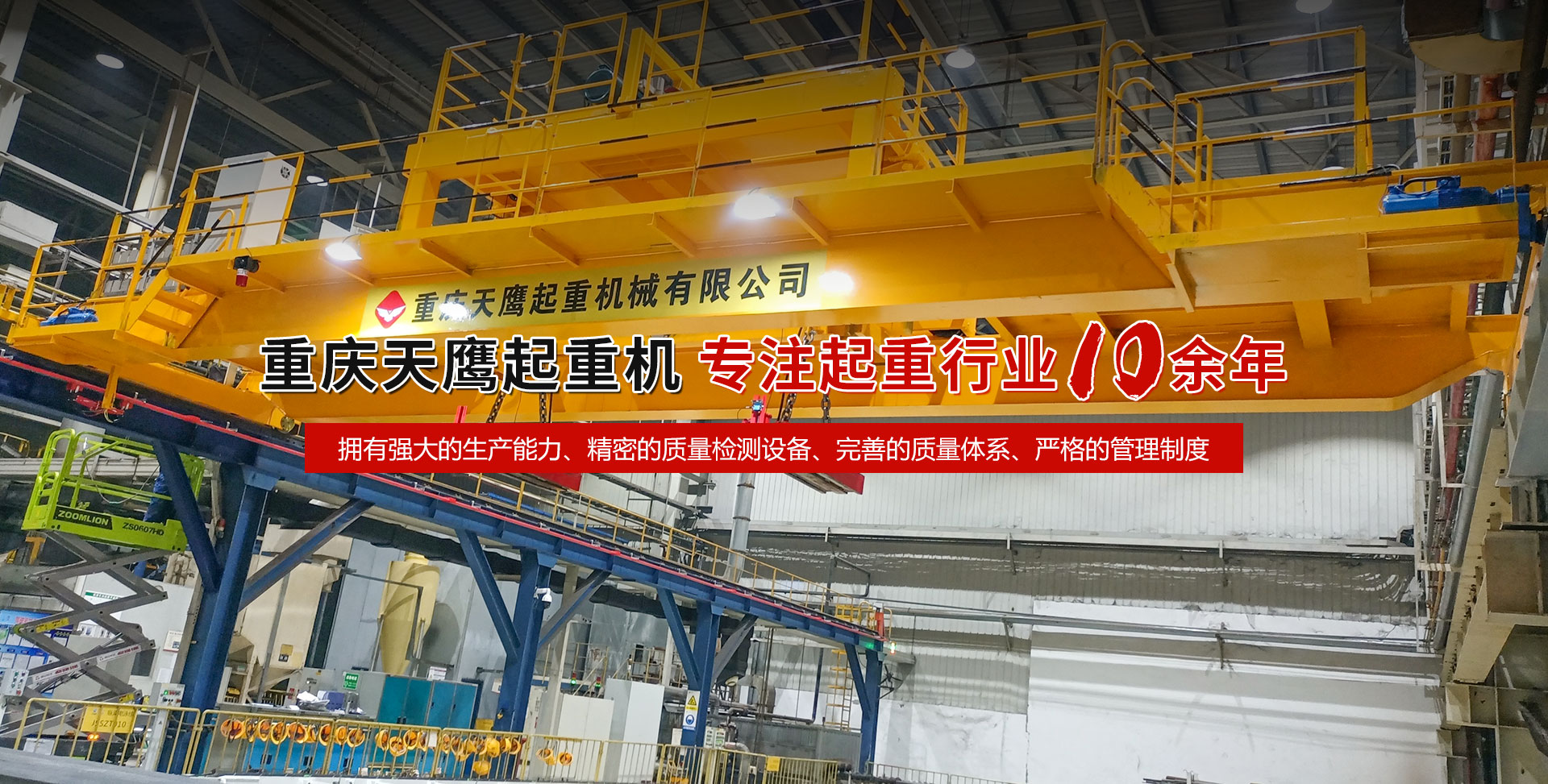 重慶天鷹起重機械有限公司成立于2014年,主營起重機的銷售、安裝和維護等相關服務。中國重型機械工業(yè)協(xié)會員單位、為中國工程機械工業(yè)協(xié)會工程機械維修分會會員單位及西南地區(qū)起重機械定點安裝維修單位。具有國家質量監(jiān)督檢疫總局頒發(fā)的特種設備安裝維修改造質格證書。并率先通過了IS09001-2000質量體系認證?! 」咀再Y金3000萬元;廠房面積2萬平方米;各種生產檢測設備50臺套,公司技術力量雄厚,聘請了國內知名起重機專家、工程技術人員擔當項目經理、技術總工程師及顧問。現(xiàn)擁有員工100多人,其中工程技術人員12人。 主導產品為各類橋、門式起重機及輕小型起重設備,具備生產起重量200t及以下通用橋、門式起重機的能力,尤其在200t以下起重機產品上具備較強的市場競爭力,為許多行業(yè)設計制造了技術含量高、技術性強的起重設備,許多產品在原設計標準上進行了較大的改進、優(yōu)化和創(chuàng)新;其中NH型系列電動葫蘆、HD型電動單梁處于國內高水平..... 好的產品品質需要由較高的裝備水平來保證,公司購買了“大型數控落地鏜”、“數控切割機床”、“自調式焊接滾輪機”、“數顯液壓板料折彎機”、“超大型數控臥式車床”、“數控液壓水平下調式三輥卷板機”、“單柱移動式立式車床”“擁有用于單梁生產的全國一條拋丸噴漆烘干線、葫蘆噴漆烘干線和全國較大的100T葫蘆試驗臺和檢測中心”等各種先進的加工設備,新建廠房面積近2萬平方米?! ≠|量是企業(yè)的生命,天鷹公司依據“ISO 9001國際質量管理體系”標準,制定并完善了公司的質量管理體制。堅持質量體系的內審和外審,將質量管理工作落實到企業(yè)生產經營的全過程。 您的微笑,是天鷹永恒的追求;天鷹的服務,是您首要的選擇!因為我們堅信:“誠信是本、質量鑄就品牌”。為您服務是我們的榮耀,勤奮而進取的天鷹人,時刻期盼著您的到來。